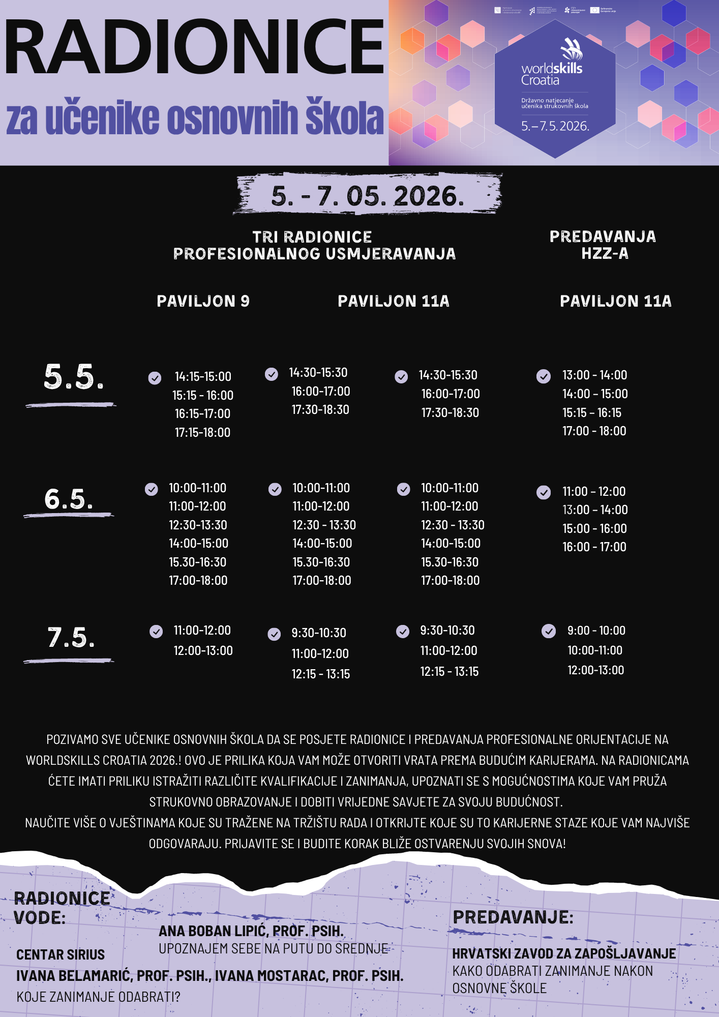 Posjetitelje očekuju interaktivne radionice, demonstracije vještina i prilika da se aktivno uključe i isprobaju različita zanimanja. Posebno osmišljeni sadržaji za osnovnoškolce pomažu mladima da na zanimljiv i praktičan način upoznaju svijet strukovnih zanimanja i lakše donesu odluke o svom obrazovnom putu.